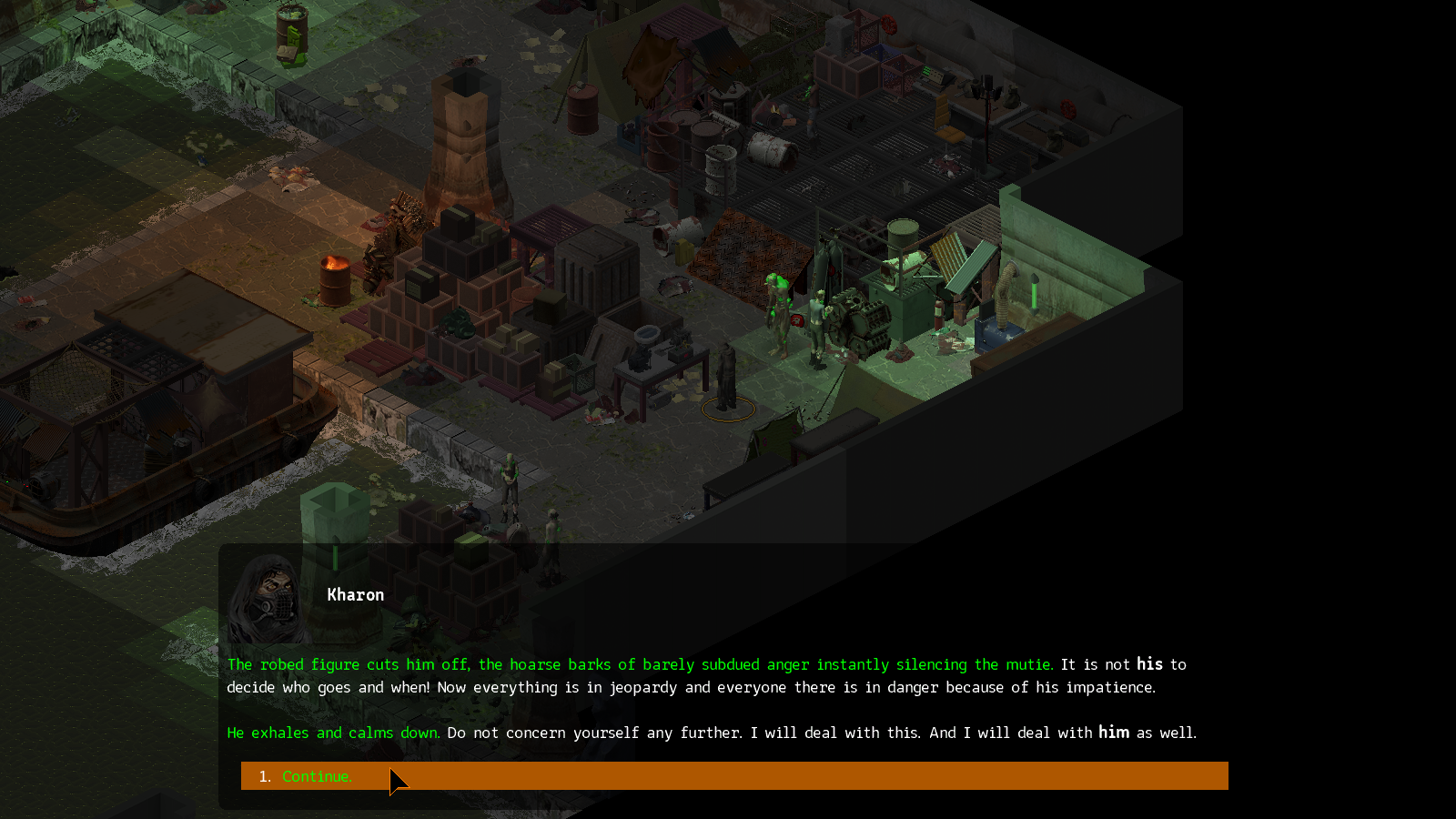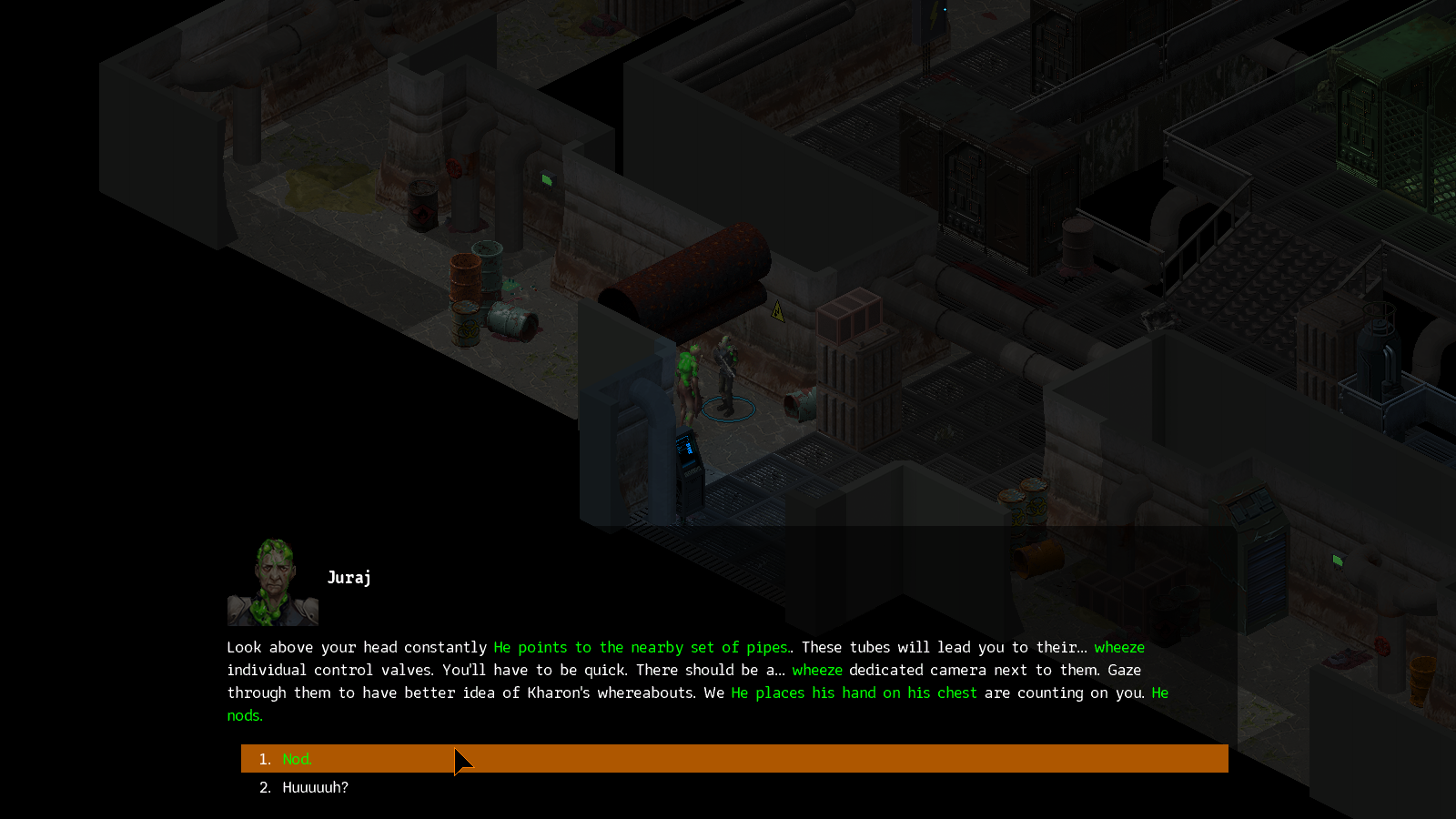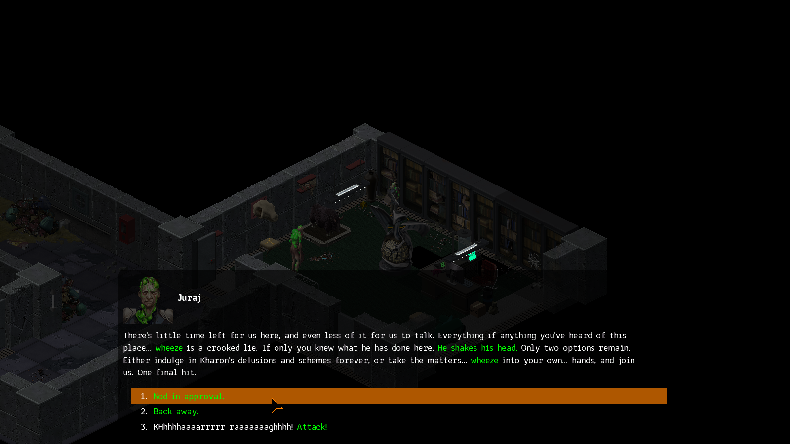 Juraj와 대화하느냐 마느냐에 따라 진행이 달라진다. 이대로 발전기를 켜는 방향으로 가면 Kharon을 따라가는 엔딩을 보게되고, Juraj와 협력하려면 Kharon을 처치해야 한다. Kharon은 상당한 강적이므로 후자의 난이도가 훨씬 어렵다.