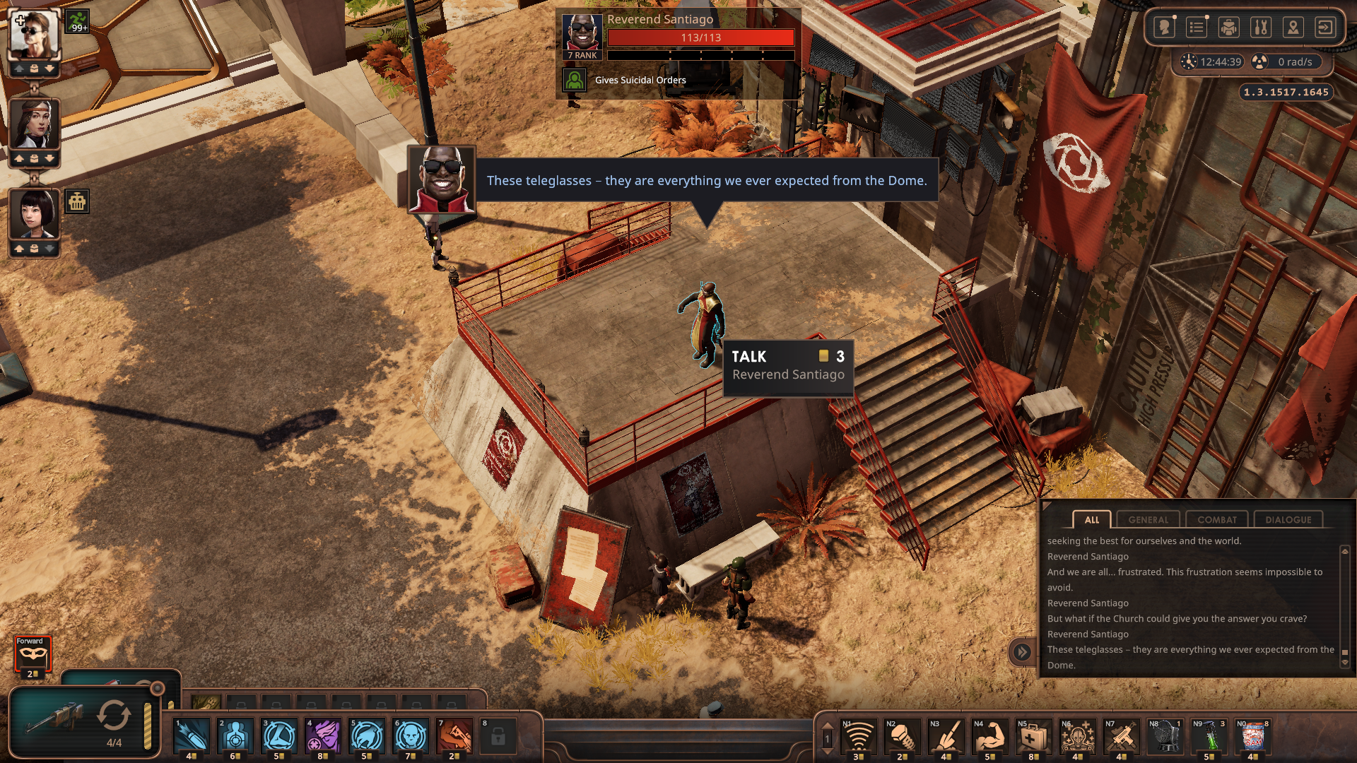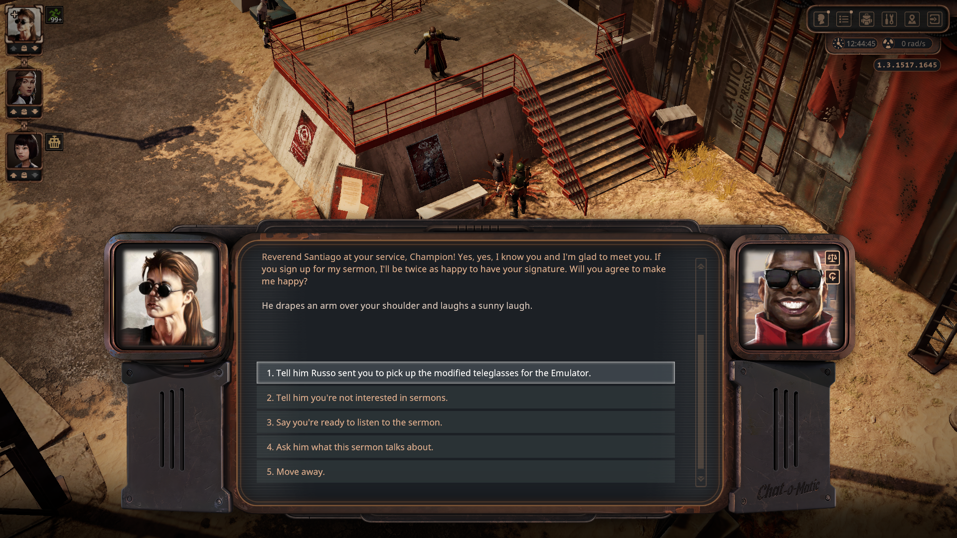정크타운 슬럼의 Reverend Santiago에게 텔레글라스를 달라고 하면 18시에 설법을 하는데 그걸 듣고나면 주겠다고 한다.