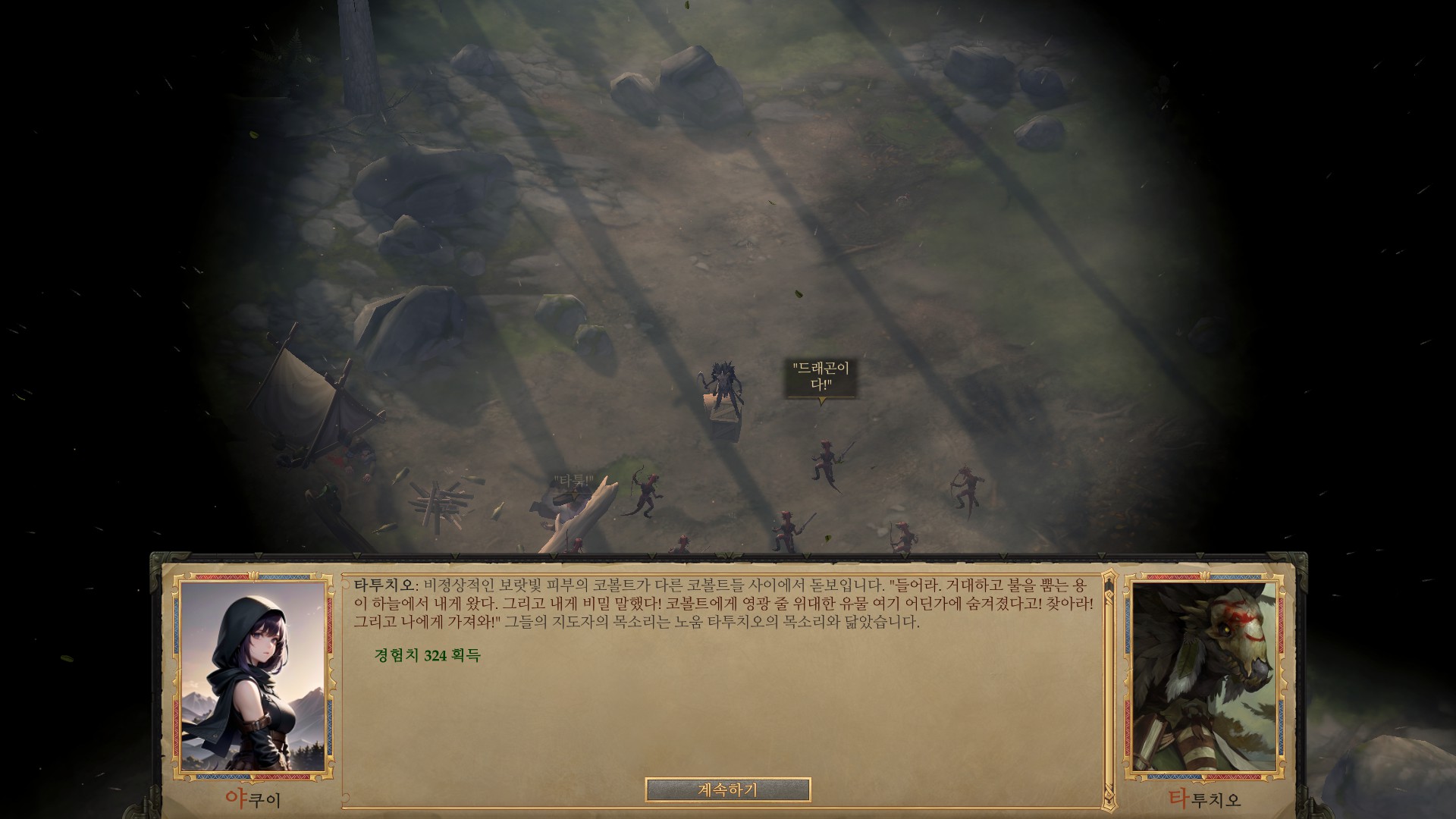 협곡 아래로 가다보면 다음으로, 큰 흔적을 추적하면 코볼트와 전투 후 월드맵으로.