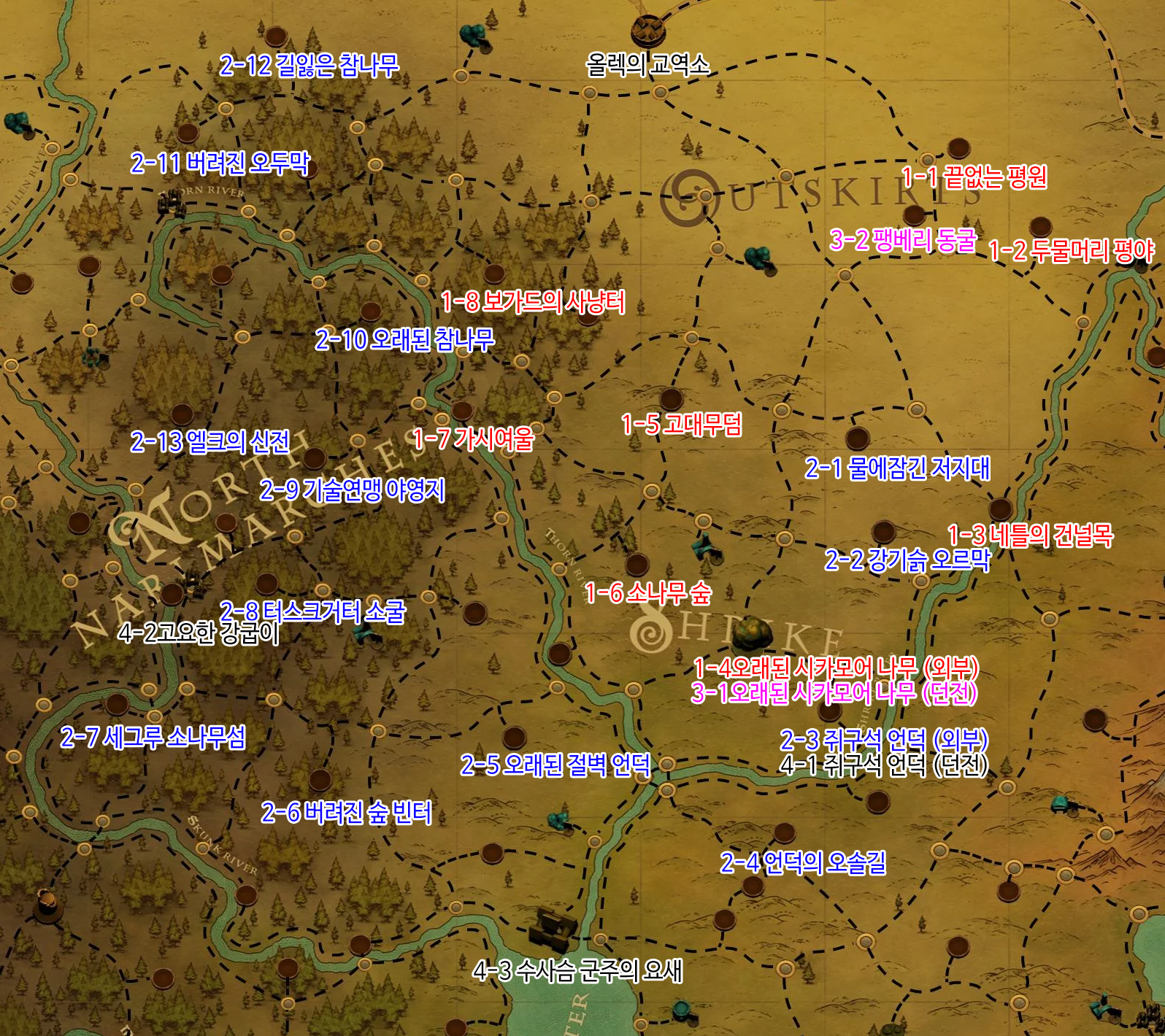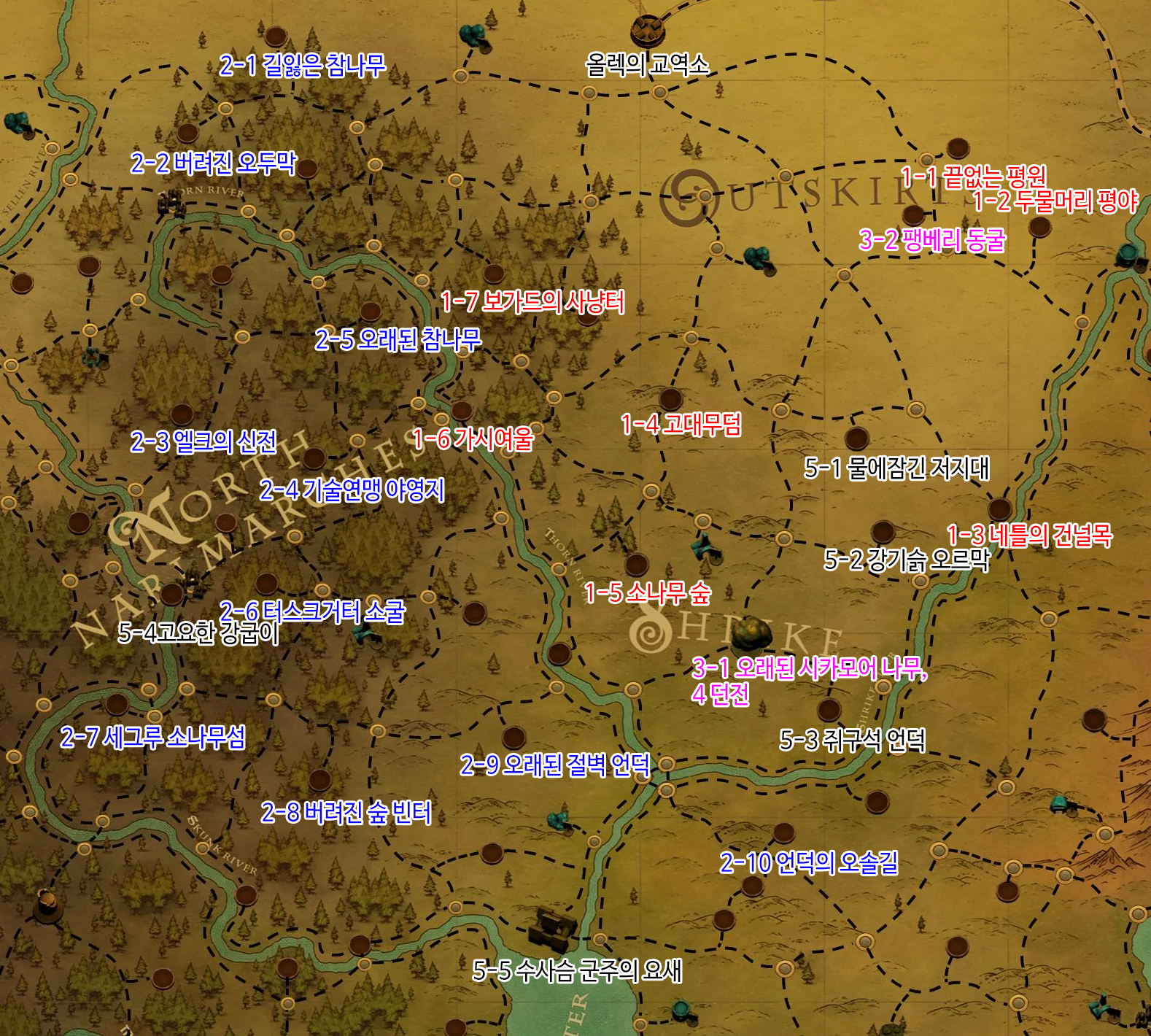 2-5 오래된 참나무와 3-2 팽베리 동굴은 화염 혹은 산성 데미지가 필요하므로 물약이나 주문을 동원해야 한다.