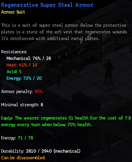 보통 일반적인 플레이에서 제작템은 150q~160q 선에서 마무리가 되는데, 이번 플레이에서 170q가 넘는 Super Steel을 여럿 구했기 때문에 갑옷 제작을 위해 Mechanic 스킬을 120까지 찍어야 했다.
