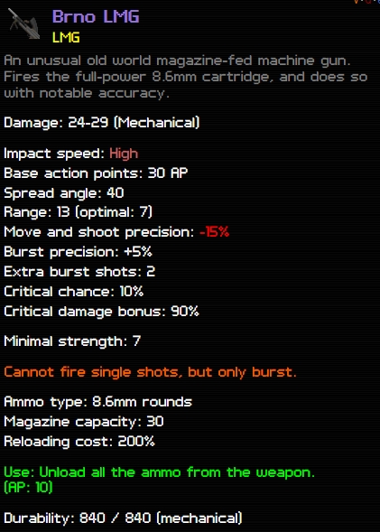 LMG 빌드에서 초반 핵심 장비. 데미지는 다소 아쉽지만 조달이 용이한 8.6mm탄을 사용하기 때문에 매우 유용하다. 입수가 비교적 쉽다는 점도 장점.