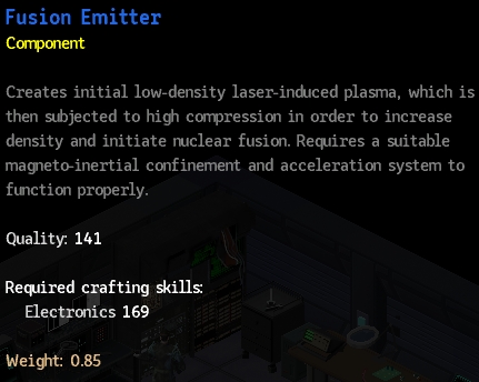 Laser Emitter, ElectroShock Generator, Circular Wave Amiplifier, ElectroMagnetic Field Stabilizer, High Efficency Energy Converter 총 5개 의 부품이 들어가는데 가장 낮은 부품의 퀄리티로 전체 퀄리티가 정해지므로 주의가 필요하다.