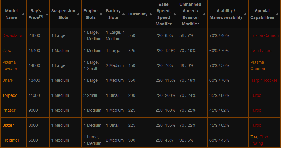 Devastator : 가장 비싸고 방어력이 우수하며 특수무기의 위력도 괜찮지만 추가 엔진을 달지 않으면 느린편이다.