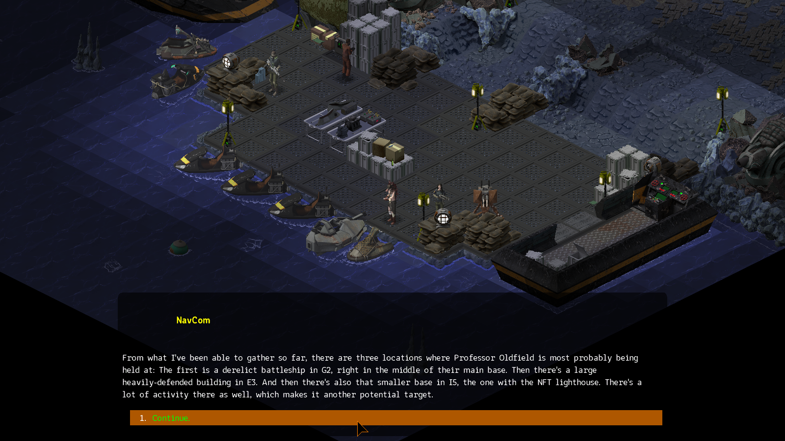 NavCom으로 Yahota와 통신하자. 교수가 잡혀있을법한 위치를 몇군데 특정해 주면서 침투하기 좋은 위치는 G4 혹은 H4 라고 알려준다.