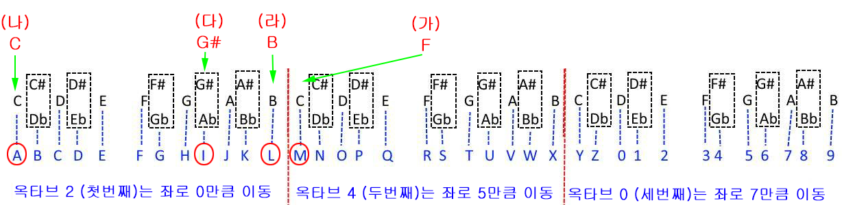 (가) 옥타브 4 (두번째) 의 F는 5 만큼 좌로 이동했으므로 M