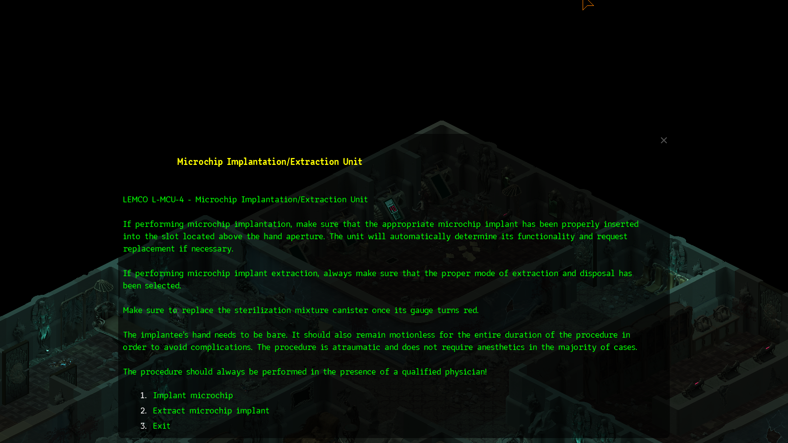 영안실 문을 열고 들어가보면 캡틴의 시체가 있는데 레무리안 블래스터와 키를 입수할 수 있다.